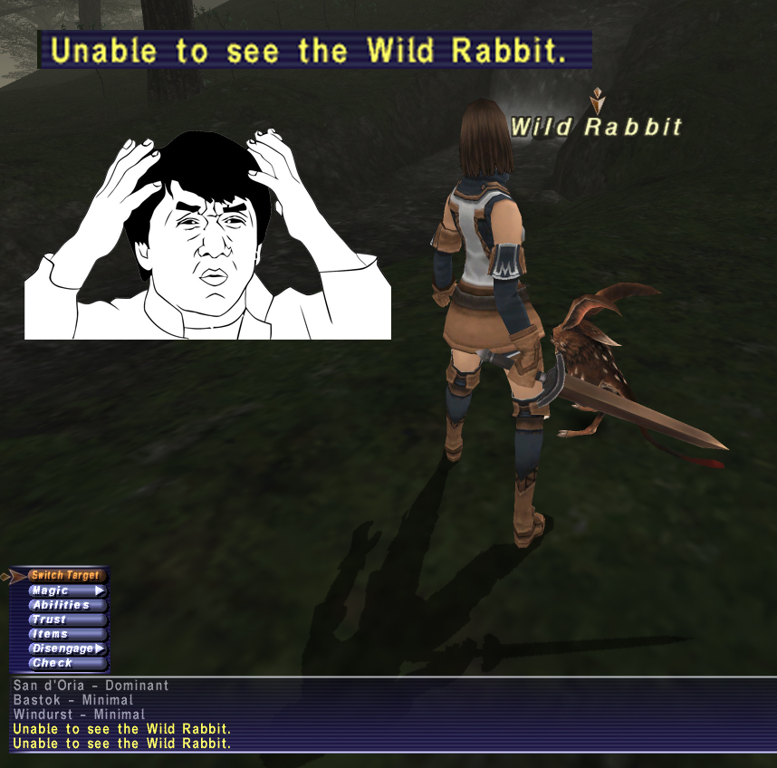 So, once I figured out how to select and attack an enemy, I chose the nearby innocent bunny (which I remembered could kick your butt flat), and Check it to make sure it wouldn’t kill me. That’s right. This is old skool MUD style. There’s no name colors or indicators to tell you how difficult something is. You have to inspect enemies to tell if it is going to promptly roflstomp you or not.