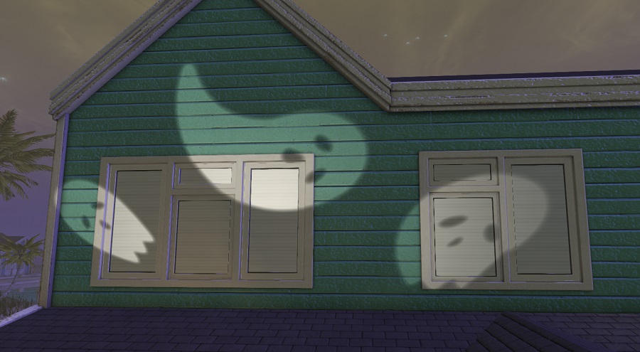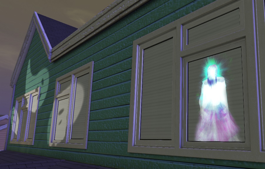I have some ghostly projectors, which I love, that show upon the second story of the house. As well as a ghostly visitor peeking through the top windows.