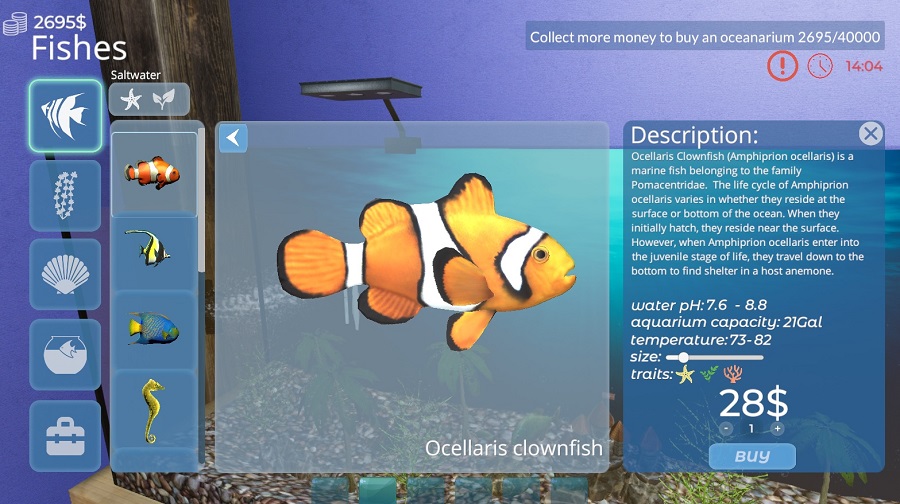 Aquarist is a sandbox simulation game in which you create your own business through building fish aquariums and completing aquarium-related jobs. I know that I just posted about Tiny Aquarium last week, but this game differs quite a bit in that it’s not a collecting game, but truly has more focus on the more technical aspects of keeping an aquarium.