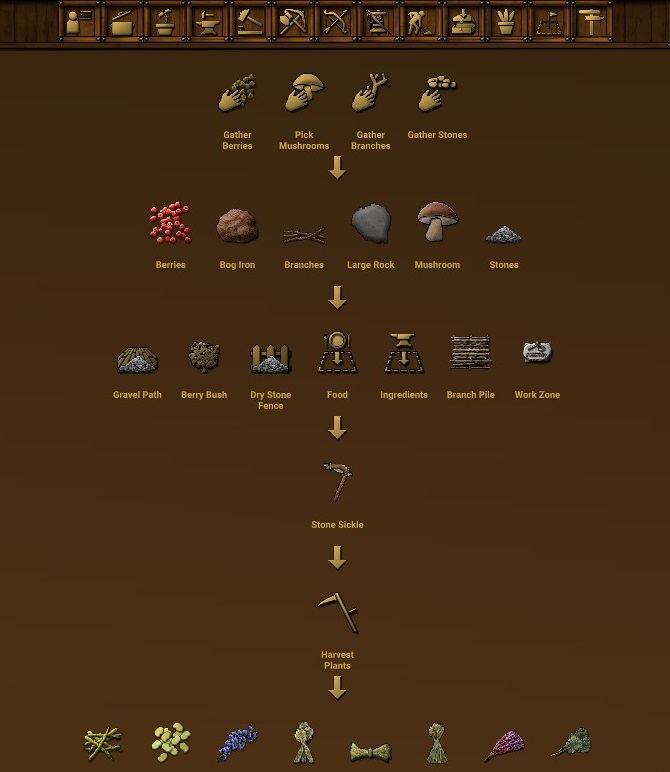 As you forage the land and find raw materials, you begin to unlock technology that you can build from those materials – the game calls these “Ideas.” Here, you fill out a technology tree where you build upon the simplest Ideas – merely gathering – to slowly figuring out how to build tools, storage, buildings and beyond.