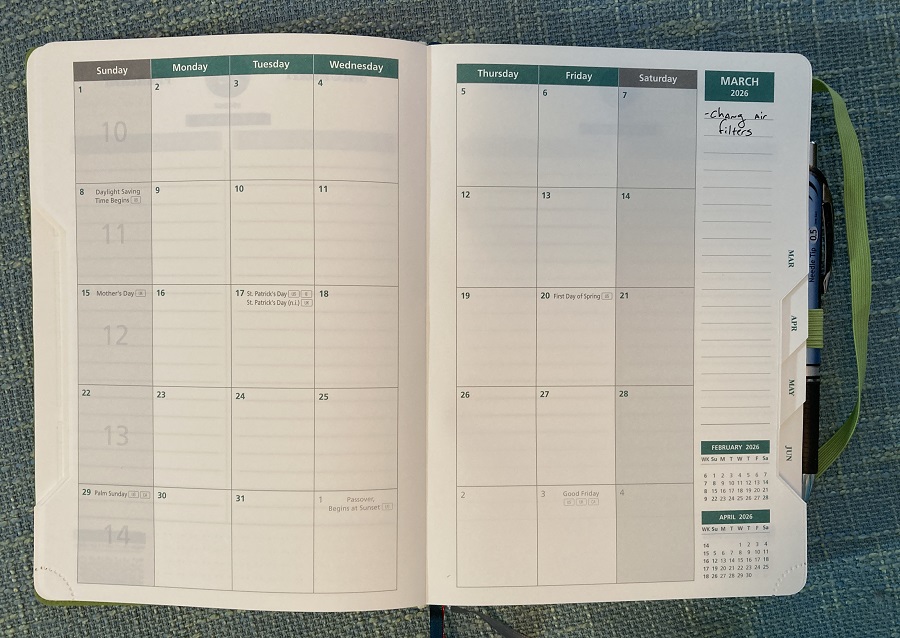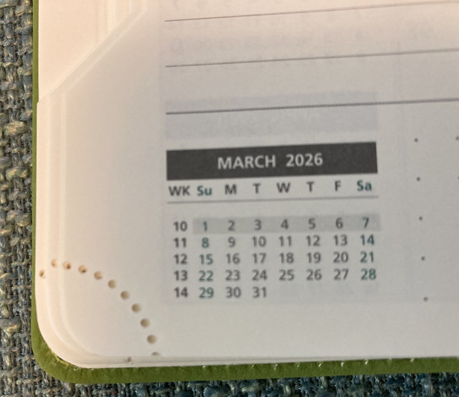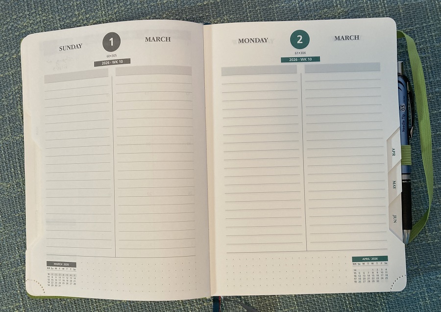 That further helps (along with the several ribbon bookmarks) to organize where you currently are in your year.