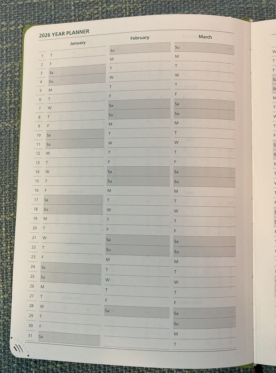 So, I decided to break it out of my Traveler’s Notebook into its own thing and see how that works next year. I’d been looking into all sorts of planners, from the popular (but expensive) Hobonichi brand, to other brands that folks say work just as well. Again, I just saw this one on sale on Amazon, and liked what I saw from the pictures, so I picked it up.