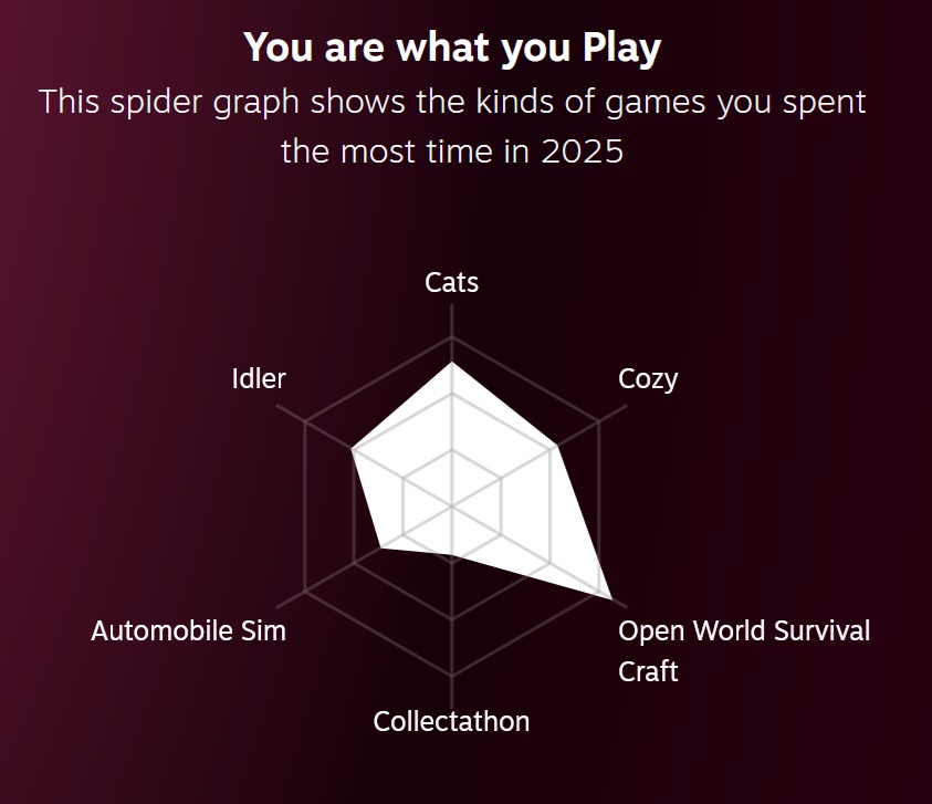 Finally, the types of games I tend to play the most in a spider graph form. Again, Chonkers skews my numbers towards “Cats” as it’s a cat game. It’s also what influenced the “Idler” and “Collectathon”. It’s weird how a single idle game can really mess with the numbers and game representation on this report.