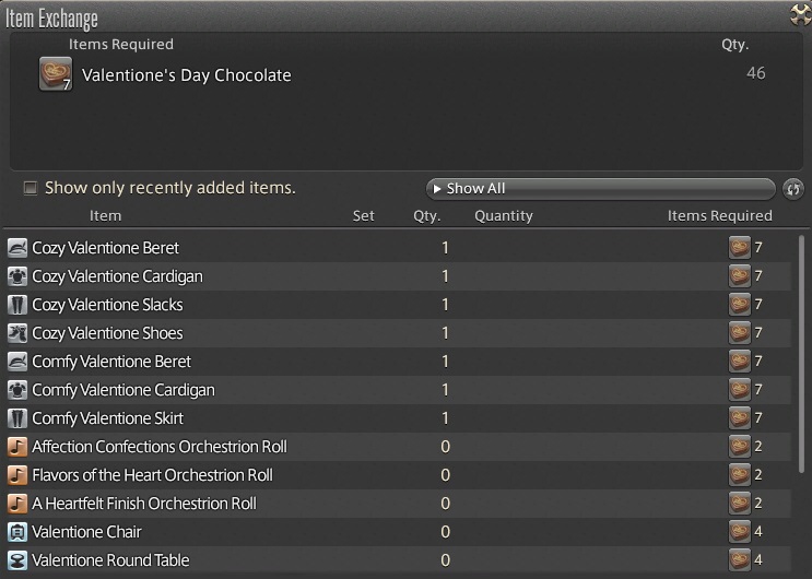 From the instance, you earn Valentione’s Day Chocolate which are the tokens you use to purchase the event’s items. This year, there’s two sets of (recolored) glam –with both a skirt and slacks variation – three orchestrion rolls, and several pieces of indoor furniture.