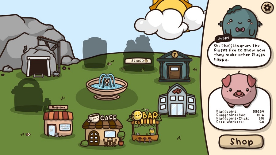 For those who don’t know what an “idle clicker” is, it’s where you start out by manually clicking some element within the game to earn some kind of resource. Here, you start by clicking the cute piggy bank multiple times to earn Fluffcoins.