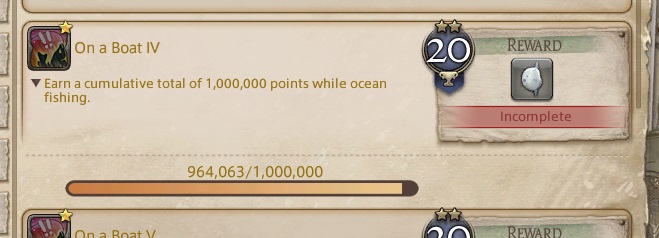 This has made me far, far more excited for fishing than I have been in a long time. In fact, I had so much fun yesterday and completely blew through earning all the tomes for the mount in one day. Today, I blew through all the tomes for the orchestrion roll that I wanted. I’m also very close to finishing the On a Boat IV achievement, which is the 1 million point achievement I set out to do.