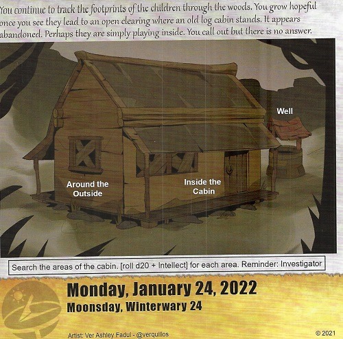 Tsavani finds a clearing with a boarded up cabin to investigate. She checks all around and even tries to open the lock on the door to no result. She does, however, see footprints leading to the well, and during her investigation, finds 1 gold.