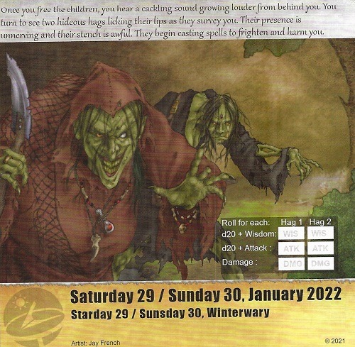 Two hags attack Tsavani with magics that “cause great mental anguish.” In fact, I have to make rolls to ensure that she isn’t terrified and fumbles her attacks at the start of the fight. Thankfully, she has a little bonus in Wisdom that helps out, and she was able to overcome the fear for both hags.