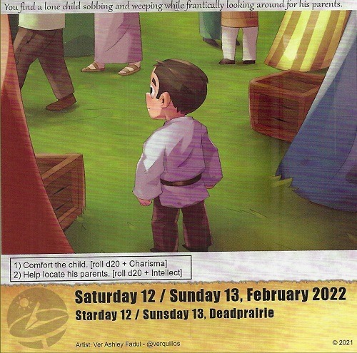 Welp, another missing child, to the surprise of anyone? Tsavani doesn’t have bonuses either way I went, but trying to locate the parents turned out best with a middling roll. I managed that, so Tsavani was able to locate the parents, and they gratefully gave her a gold as thanks. Well, that paid for the game of hide and seek from yesterday, at least!