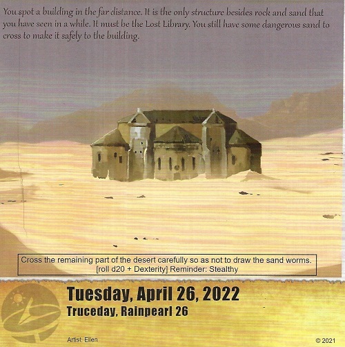 Sneaking across the desert as to not alert more sandworms. Tsavani has this well in hand with bonuses in Dexterity and +2 with Stealthy. I really love it when rolls check for Dex!