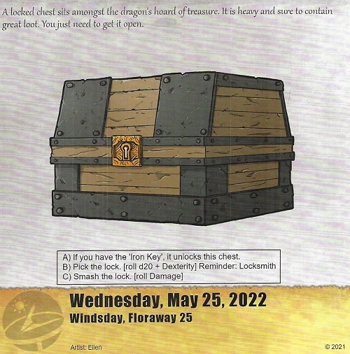Today was a pretty quick and easy page. Tsavani didn't have the key, but with a solid roll and all her DEX bonus, she was able to easily pick the lock. Treasure will be revealed tomorrow!