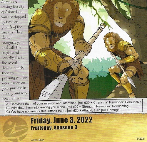 Tsavani would think it rude to up and attack other feline races, so she tried the convincing route at first. Didn't work. So she was forced to move on to intimidation, which she did succeed in, thankfully. She wasn't forced to fight them and they let her through. However, I really need to put some points into either charisma or strength because these stats seem to come up often in situations like this. Maybe next level.
