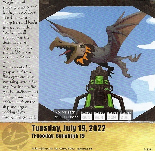 Time to blast that bird! I did well with all my rolls, the bonus helping quite a bit as well. Tsavani managed to take them all out without taking any damage. She might actually be a natural gunner!