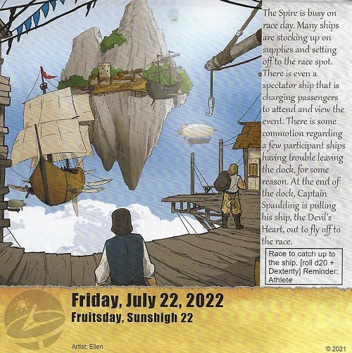 Running to get back on board the ship - racing for the race! My roll was miserable today, but Tsavani's Dex and Athlete bonus were enough to leap her on to the ship, though not without taking 2 HP in damage. Meh.