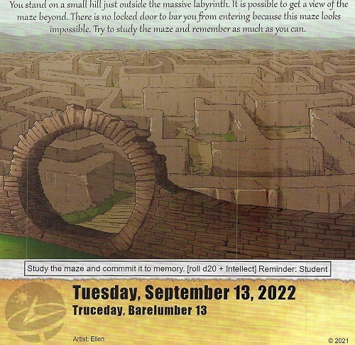 Memorizing a maze such as this seems a bit of a stretch, but okay! I rolled well, so Tsavani gets a +3 bonus to all of her rolls tomorrow. Something tells me that she's going to need it.