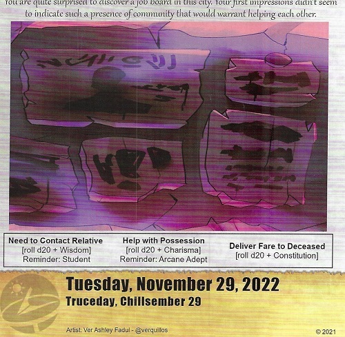 Tsavani did all the jobs except for Help with Possession - she's not going to assist with that and lose a virtue point! I did have to use her two extra points to prevent her from taking an hit of 4 HP on the Delivery quest, though. She's probably going to need all the HP as she can get.