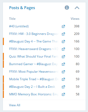 Interestingly enough, my most visited post was simply an embedded YouTube video about the FFXIV Heavensward dragoon rotation. Certainly an awesome video, but not a true post. Again, we see two other non-August posts were related to Heavensward and still getting a lot of views.