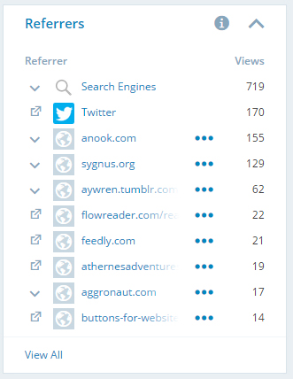 Then, of course, my own sites: Sygnus.org and Aywren.tumblr.com – Interesting how many people did click through from Tumblr this month.